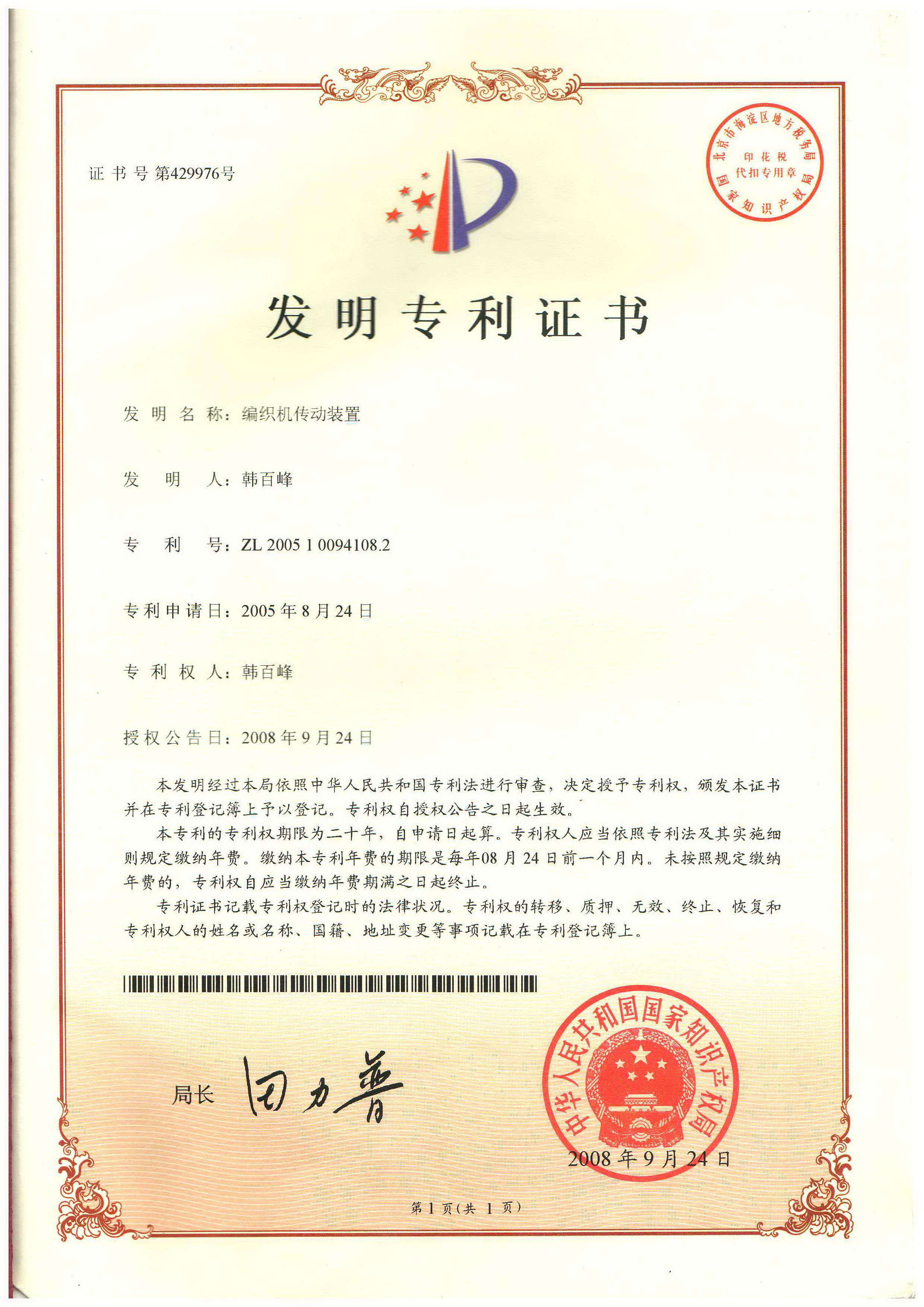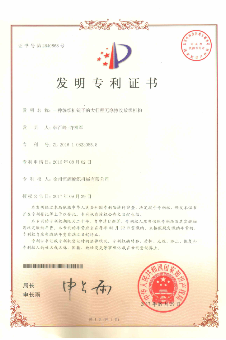 证书号第2640868号