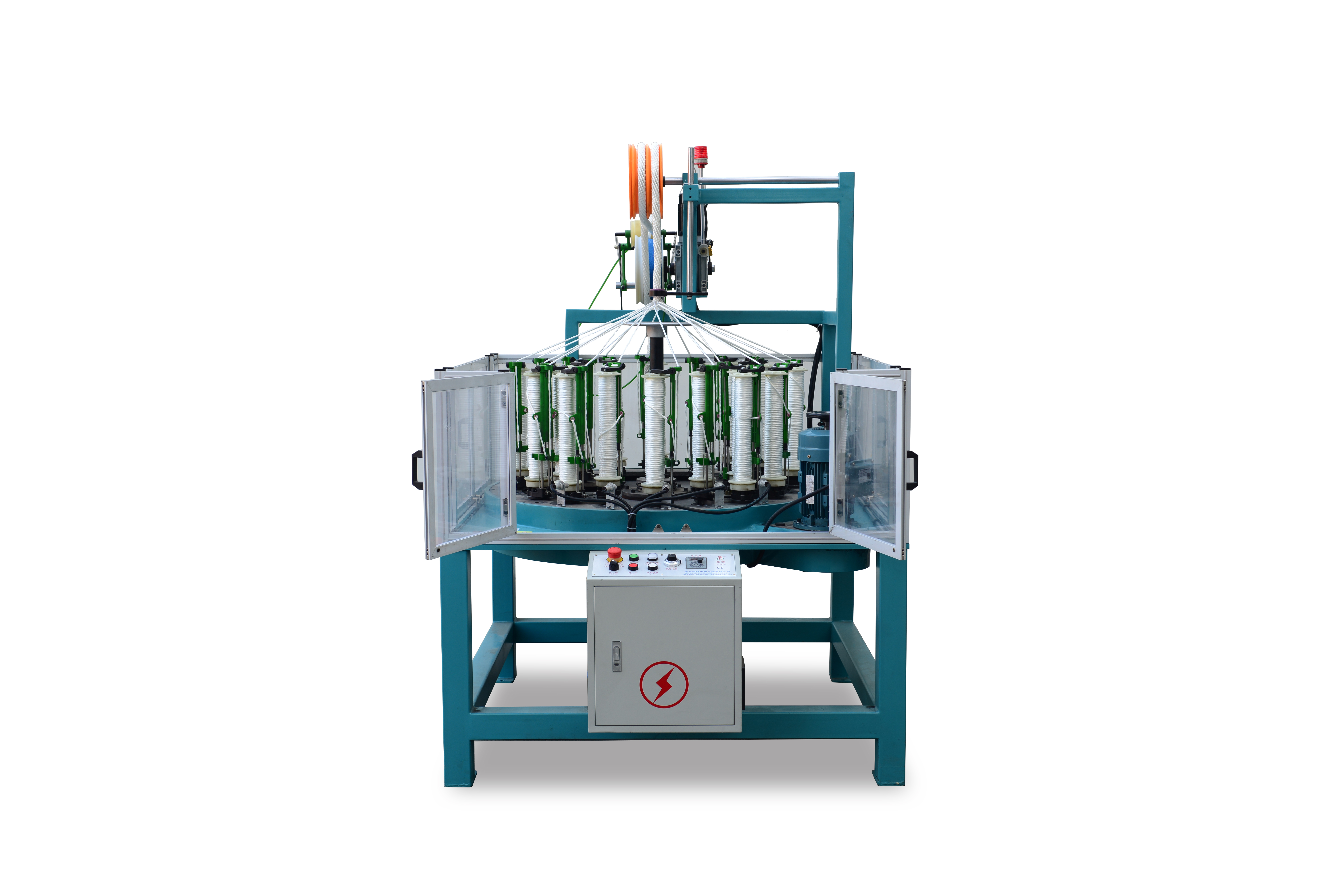 特点: 此机器设计合理,占地面积小,方便操作,纱管容量大,产量高,节距可调(齿轮或伺服电机),机器断线...